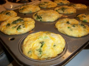 opted to toss Canadian bacon, spinach, green onions, and cheddar into the bottom of 12 muffin cups before pouring beaten eggs over the whole mess.* (I did stick to mostly egg whites…for the sake of my cholesterol.) Bake at 375* for about 15 minutes. They reheated eggs-ellently! π Simply toss two into a Ziploc or Tupperware and throw in the microwave for 45 seconds. Β Next week, I think I will try red peppers and feta cheese.