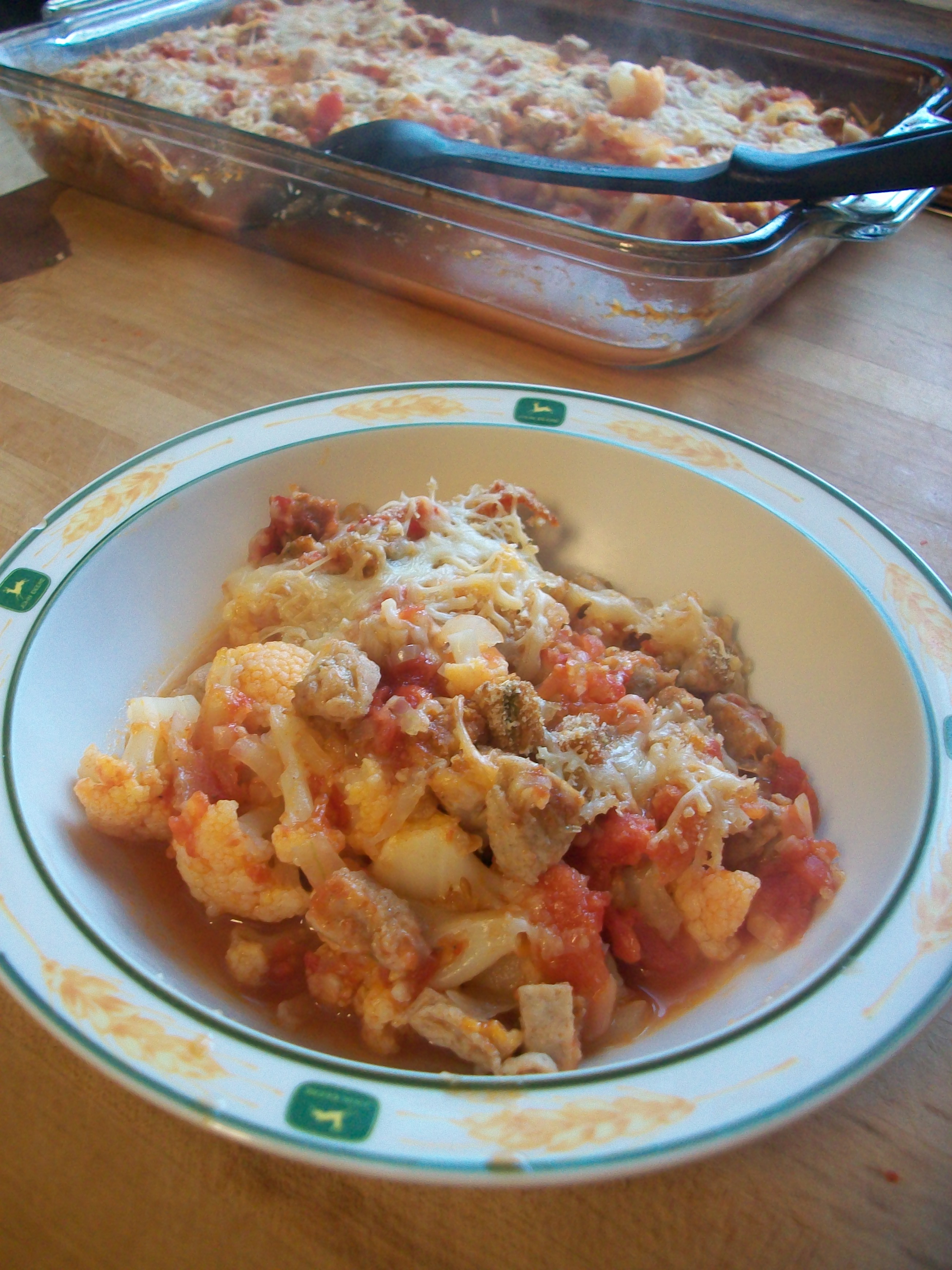 • Pour sausage/tomato mix over cauliflower. Sprinkle with parm and bread crumbs.