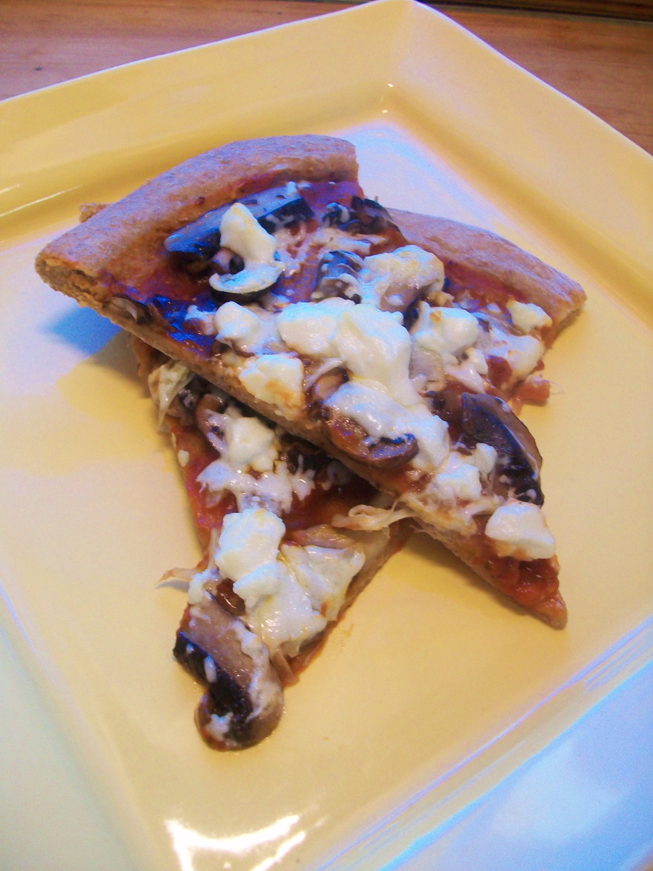 Once dough has rested, knead slightly, and roll onto 12 inch pizza stone. Bake at 425* for 15ish minutes. Remove from oven, top with pizza sauce, mushrooms, garlic, and cheese. Return to oven and bake until cheese is bubbly and browned.