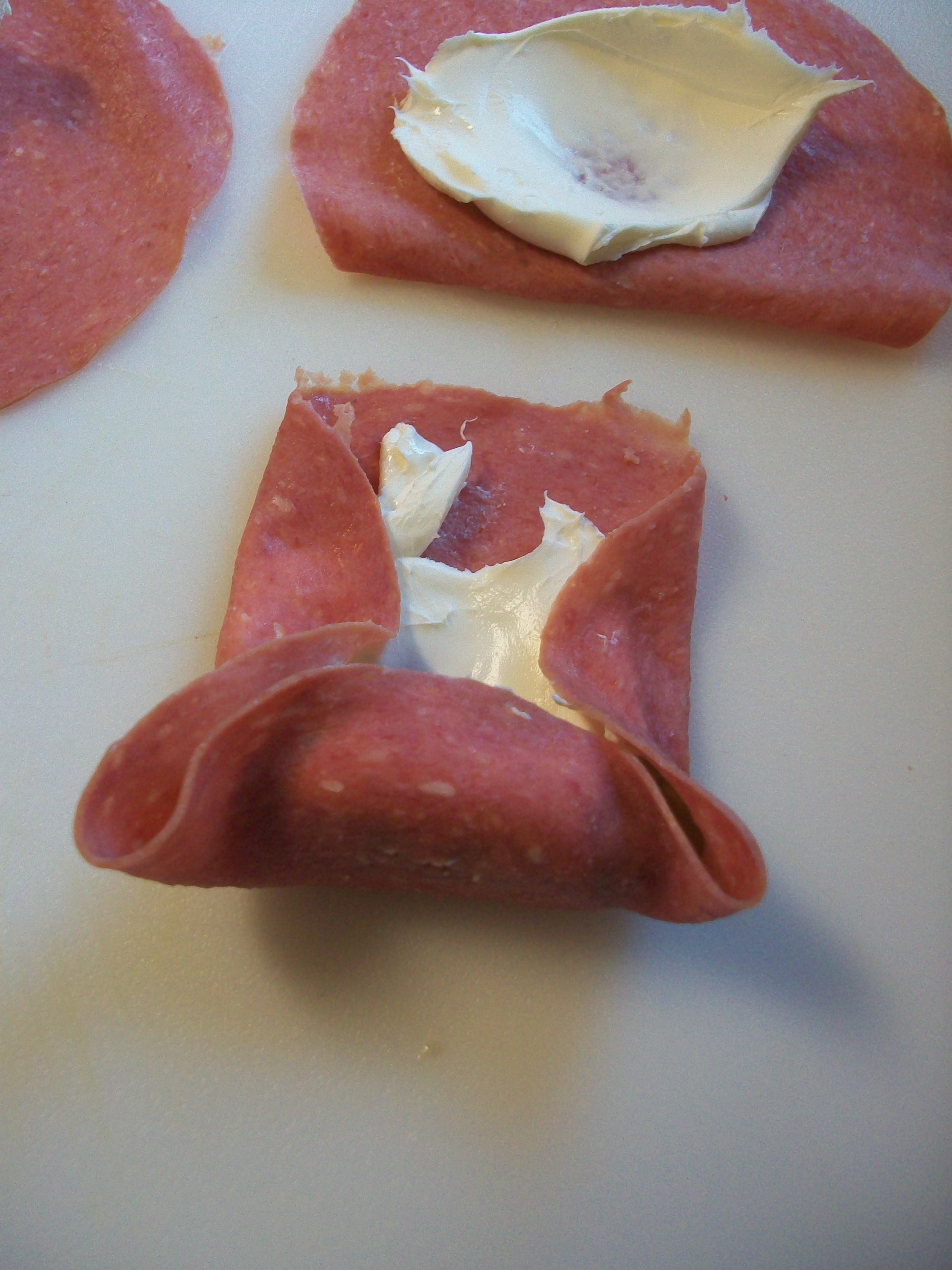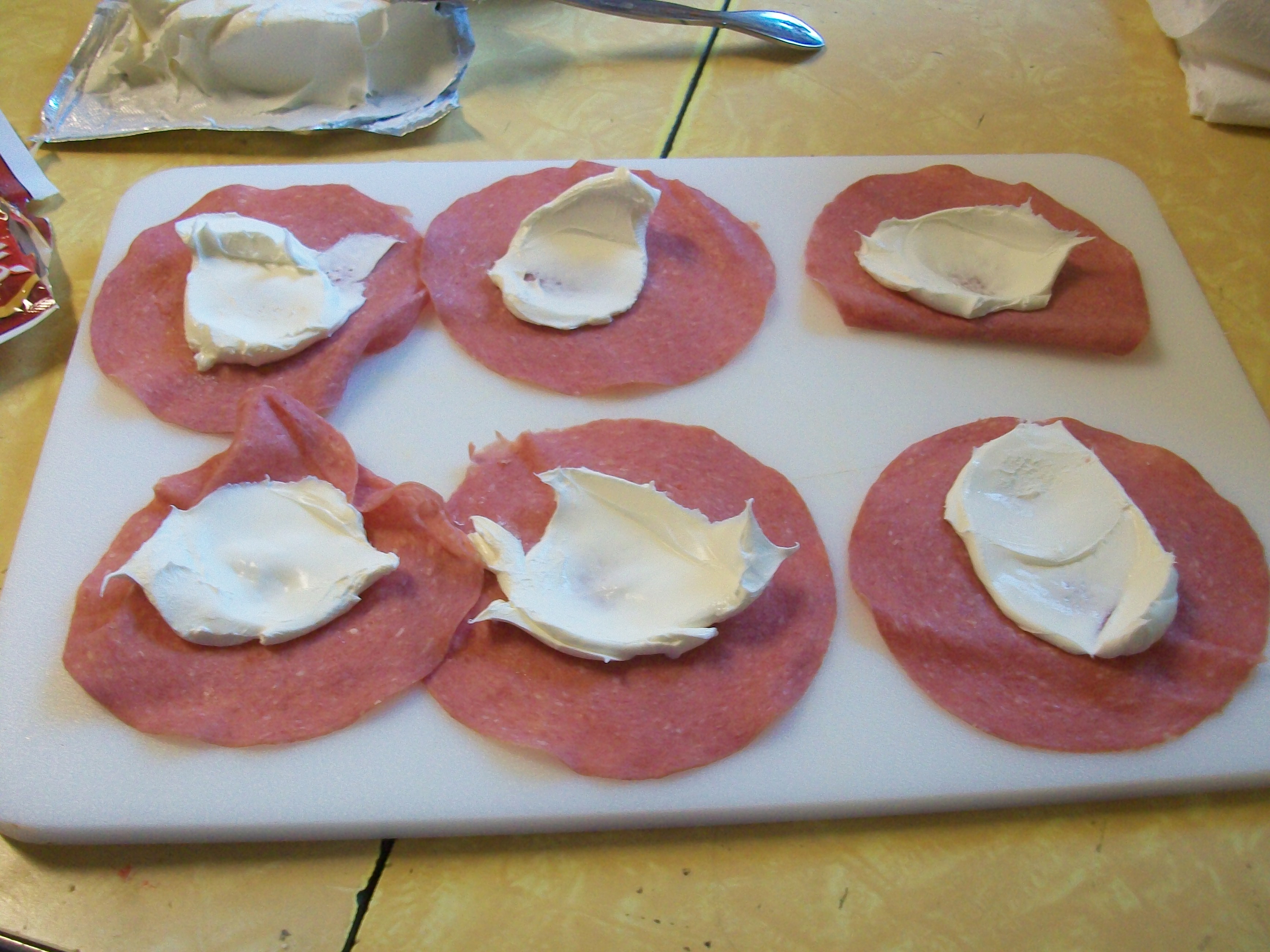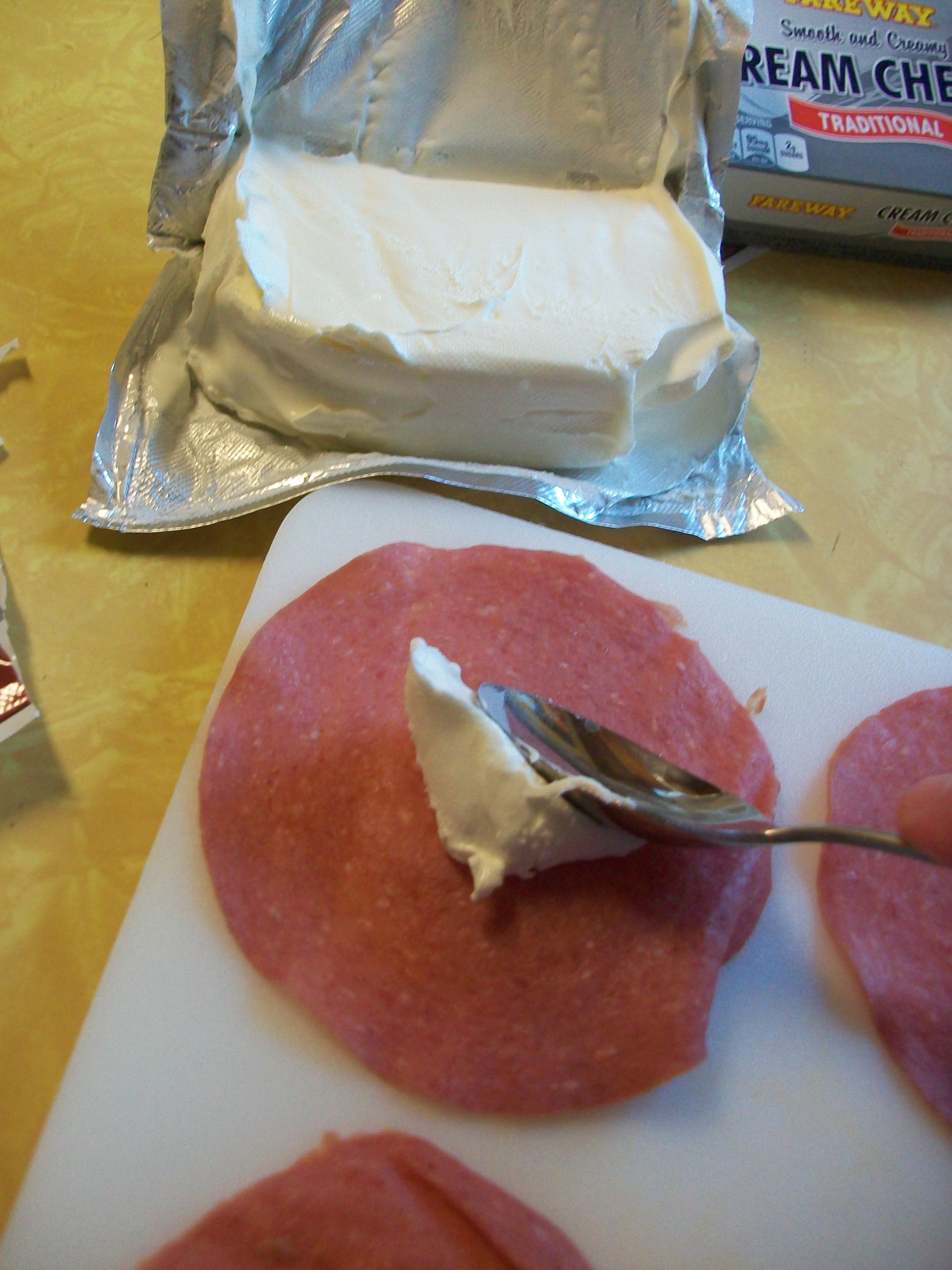 Please, people, STOP buying full size pickles, wrapping them, and slicing them. Baby dills are the only way to go! As you can see, I have no qualms about buying off brand pickles and cream cheese, but I would NEVER buy anything but Carl Buddig corned beef. I made that mistake one time, and I had to go back to the store for Buddig.