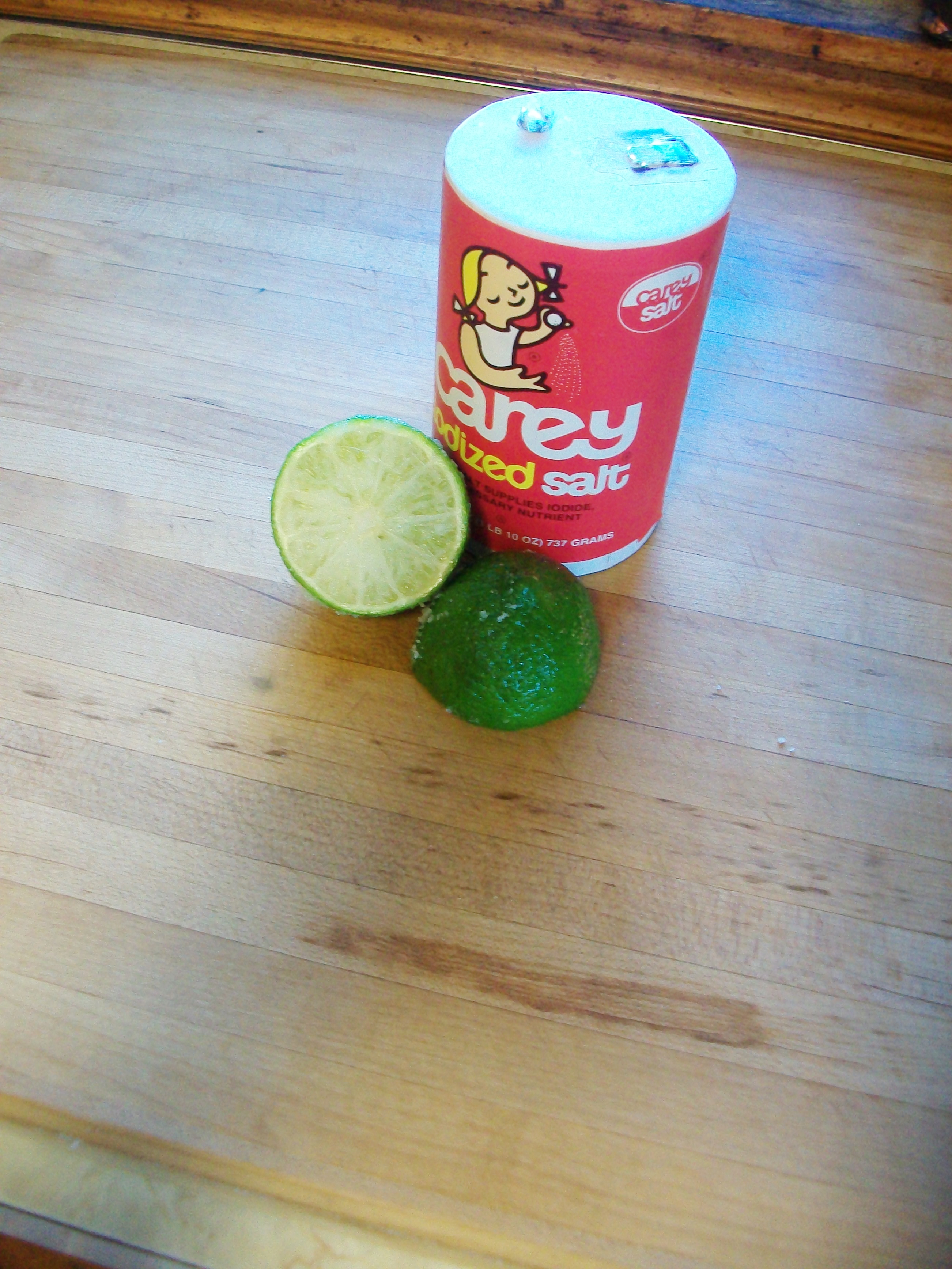 I’ve found it really doesn’t matter what citrus fruit you use for this cleaning method; you just need the acid combined with the grainy salt. Squeeze out a few tablespoons of juice, pour in enough salt to make a paste, and use the other half of the fruit as a scrubber. When you are satisfied, wipe your board clean with a paper towel. You will end up with a bit of a mess on the counter from all the salt, but the board is as sparkly as you are going to get a wooden cutting board! Plus, this is a handy trick for after a party when you are stuck with cocktail fruit (lemons, limes, oranges) and a dirty counter!