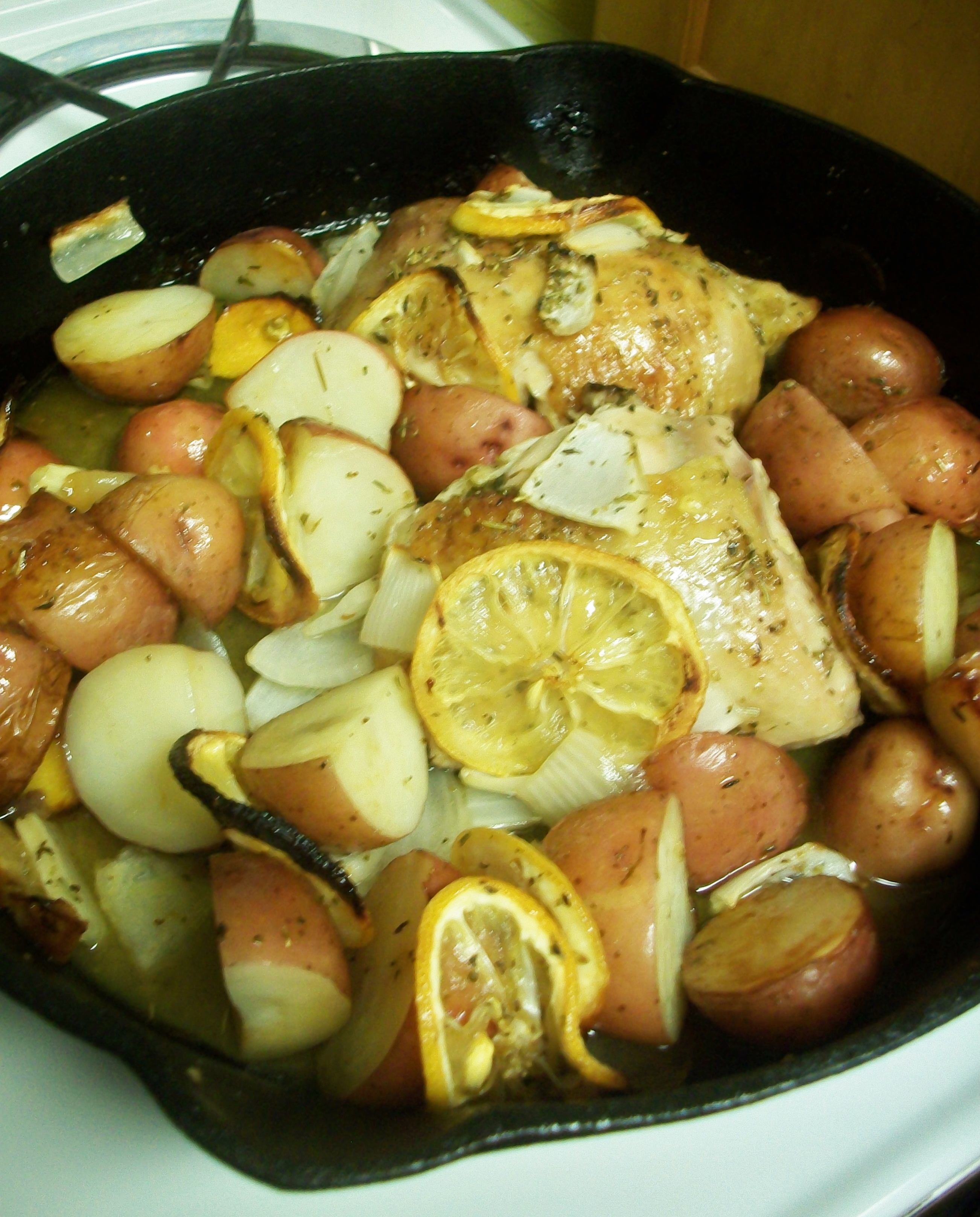 - Place in 400* oven until chicken is cooked through and potatoes are soft (45+ minutes).