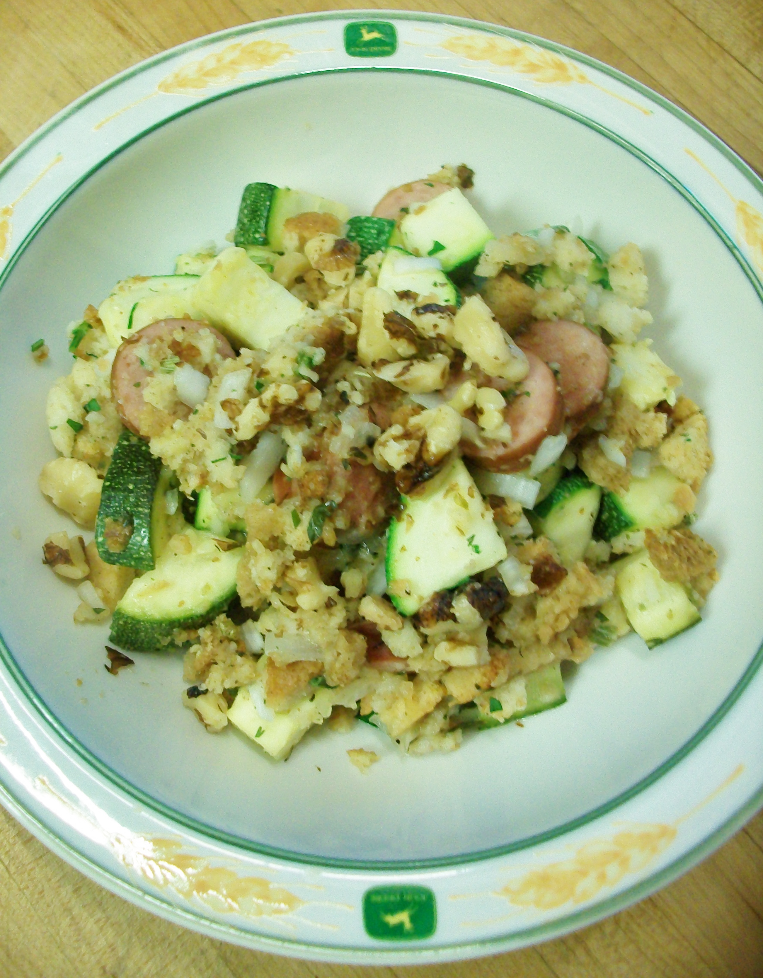 I confess that my broth measurement is an approximation. Add more or less depending on how moist you prefer your stuffing. I wish I would have diced up the zucchini smaller, but other than that, this was an awesome comfort meal. By the way, a handful of chopped walnuts on your serving will add a yummy crunch.