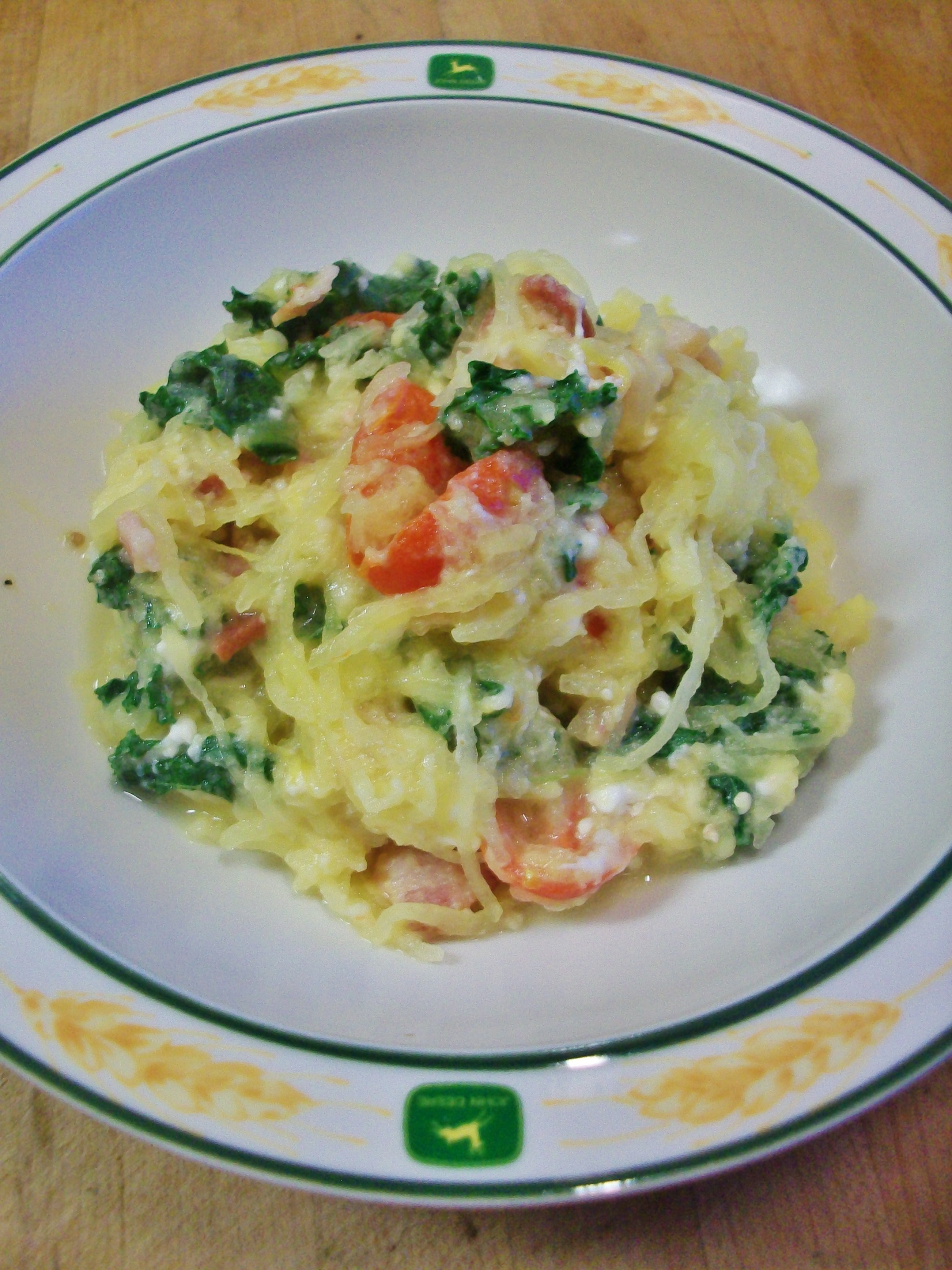 The kale leaves will begin to wilt when you stir in the hot spaghetti squash, but don’t be alarmed as they will finish wilting in the oven. If you want to be more ambitious, you can certainly saute the kale and tomatoes (and garlic!) in the bacon grease. Mmm….. There was a bit of liquid in the casserole as the vegetables released their juices, but the overall flavor was great!